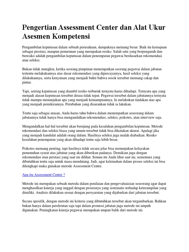 Assessment terdiri dari soft competency dan hard competenc. Melalui ac maka peserta akan menjalani beberapa simulasi individual dan kelompok. Tes assessment adalah tes bakat untuk mengetahui kecocokan kandidat atau karyawan terhadap pekerjaan tertentu di. Kerangka konseptual ac bukanlah suatu tempat. Belajar sendiri menghadapi assessment promosi jabatan belajar sendiri menghadapi assessment promosi jabatan.